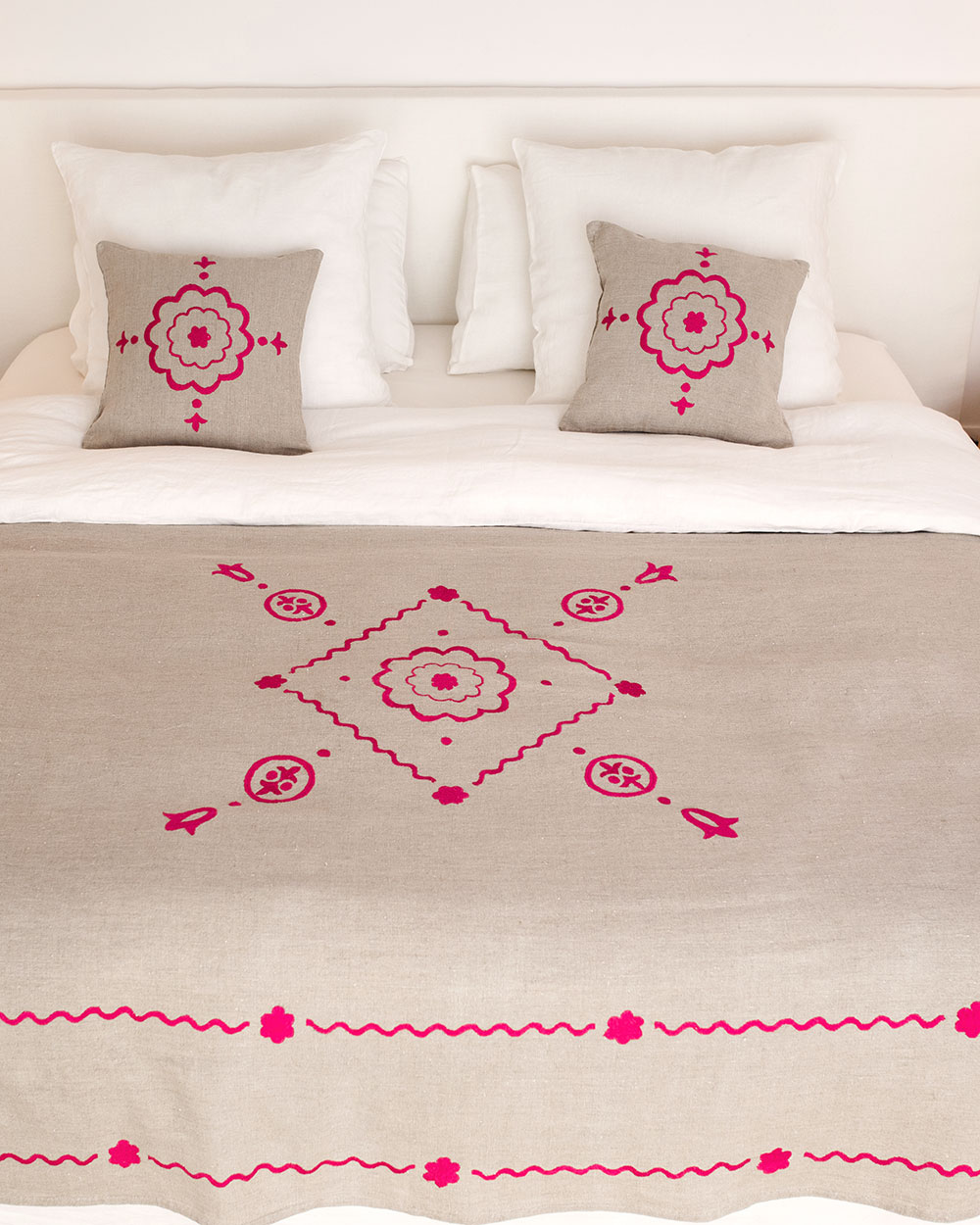 Le dessus de lit NIYAT est confectionné en lin naturel beige et orné de broderies rose-framboise réalisées à la main.