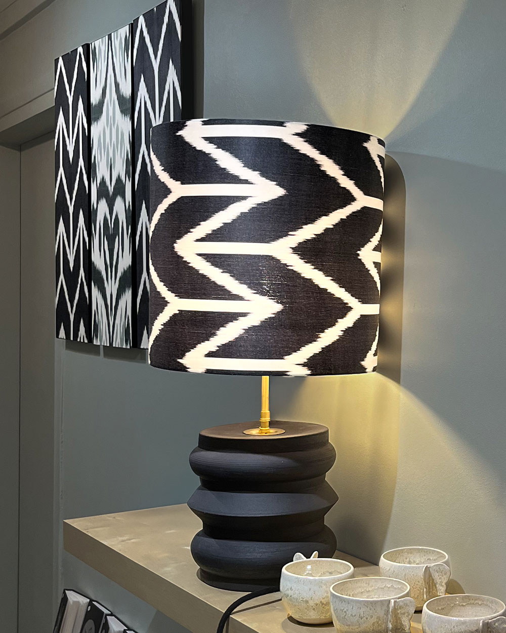 L’abat-jour est réalisé en soie ikat, tissée à la main dans des ateliers familiaux en Ouzbékistan.