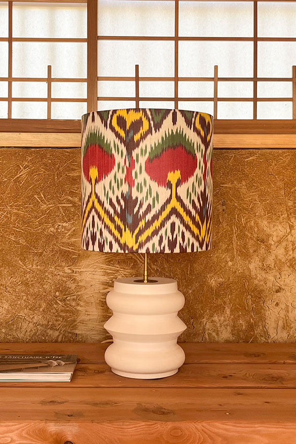 Abat-jour en soie ikat aux motifs vibrants, dessiné et fabriqué en France, à partir de soie tissée artisanalement en Ouzbékistan