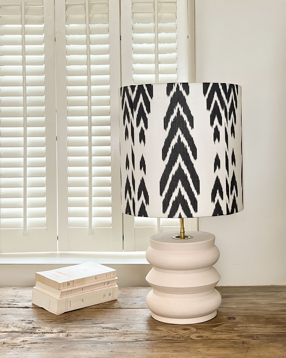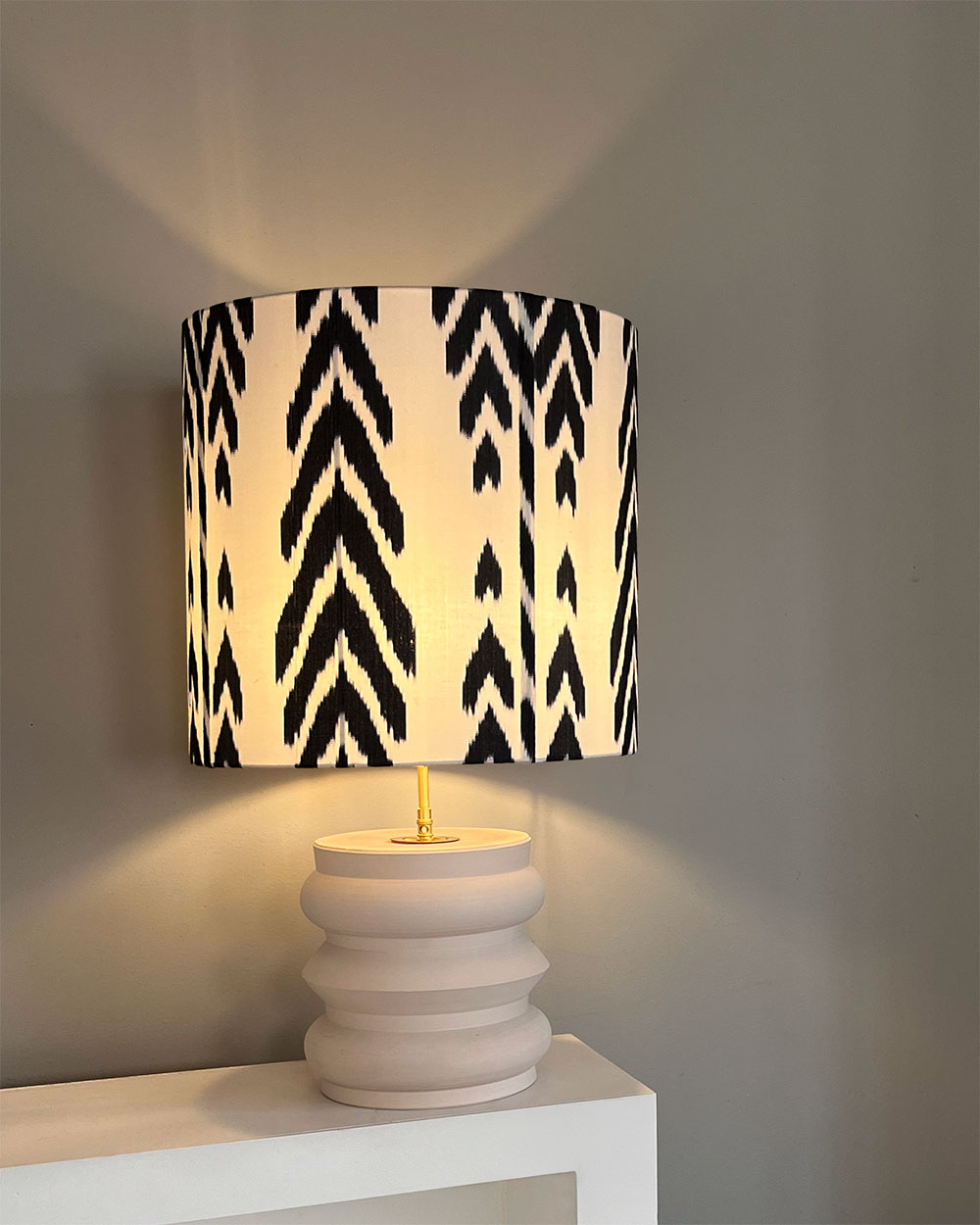 Son abat-jour est réalisé en soie ikat noire et blanche, tissée artisanalement dans des ateliers ouzbeks. Le pied en faïence mate tournée à la main à Paris crée un bel équilibre entre modernité et authenticité. Chaque lampe est unique, témoignant du savoir-faire artisanal.