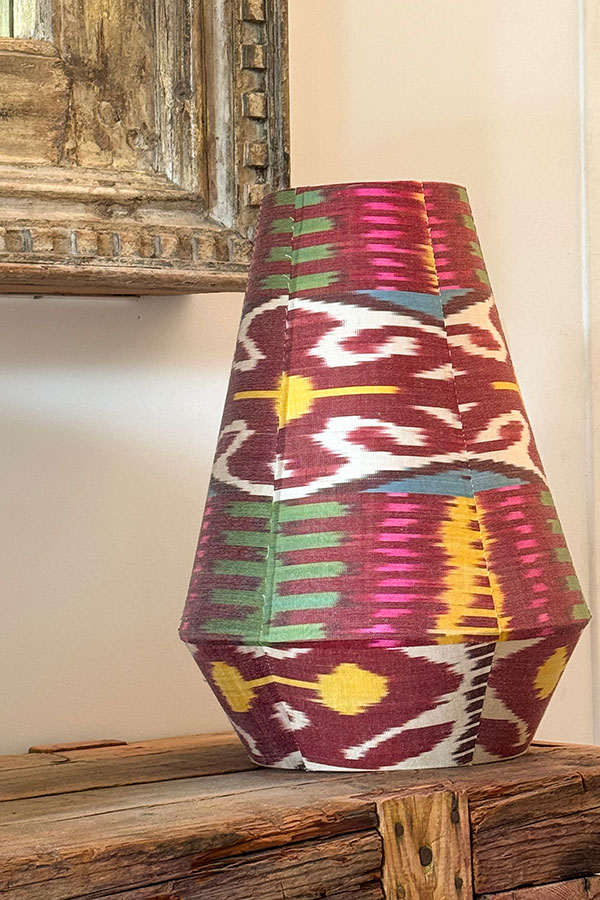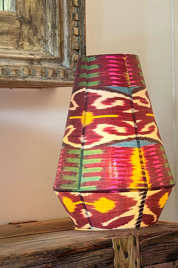 Les tissus utilisés pour cette lanterne sont tissés à la main en soie ikat dans des ateliers familiaux en Ouzbékistan. Le motif est vibrant, irrégulier, vivant.
